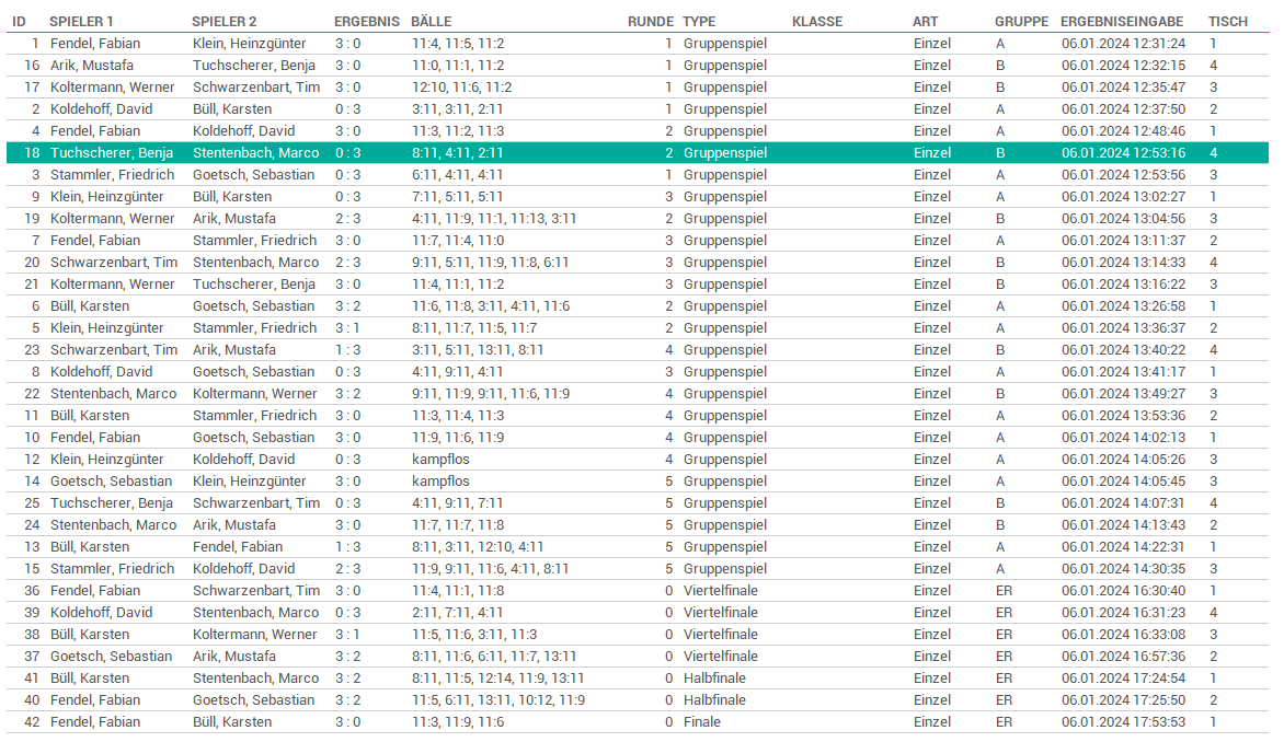 Das Turnierformat war vielseitig und bot den Teilnehmern die Gelegenheit, ihr Können sowohl im Einzel als auch im Doppel unter Beweis zu stellen. Die Einzelkonkurrenz begann mit einer Aufteilung in zwei Gruppen, gefolgt von einer packenden KO-Phase für die besten 8 Spieler. Gleichzeitig wurden die Doppelpartner aufgrund ihrer TTR-Werte zusammengestellt, um ein faires und ausgeglichenes Spielniveau zu gewährleisten.