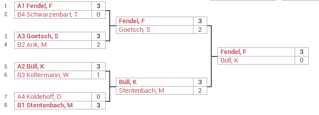 Hier konnten sich Fabian, Marco und Karsten jeweils klar durchsetzen. Das Duell Sebastian gegen Mustafa wurde erst mit 11:9 im fünften Satz für Sebastian entschieden. Die Halbfinals waren auch denkbar knapp und konnten alle erst im fünften Satz entschieden werden. Auch Fabian musste erstmals an diesem Abend über 5 Sätze gehen, konnte das Halbfinale gegen Sebastian dann aber mit 11:9 im fünften Satz für sich entscheiden. Das andere Halbfinale gewann Karsten mit 13:11 im fünften Satz. Im Finale setzte Fabian sich dann aber wieder deutlich mit 3:0 gegen Karsten durch. Der dritte Platz wurde auch noch ausgespielt: Hier konnte wiederum erst nach 5 Sätzen Sebastian, der dieses Mal auch die Turnierleitung übernommen hatte, das Spiel zu seinen Gunsten beenden und sich damit gut 6 Stunden nach Turnierbeginn den dritten Platz sichern.